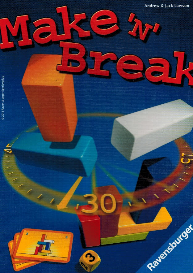 Make 'n' break [Gra] : zbuduj i zburz / Andrew & Jack Lawson. - Ravensburg : Ravensburger, 2018. - Pudełko zawiera: 1 czasomierz ; 10 dużych klocków drewnianych ; 80 kart z planami budowy ; 64 żetony